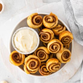 These easy mini cinnamon rolls use crescent roll sheets, sweet brown sugar, and cinnamon, topped with a cream cheese frosting.